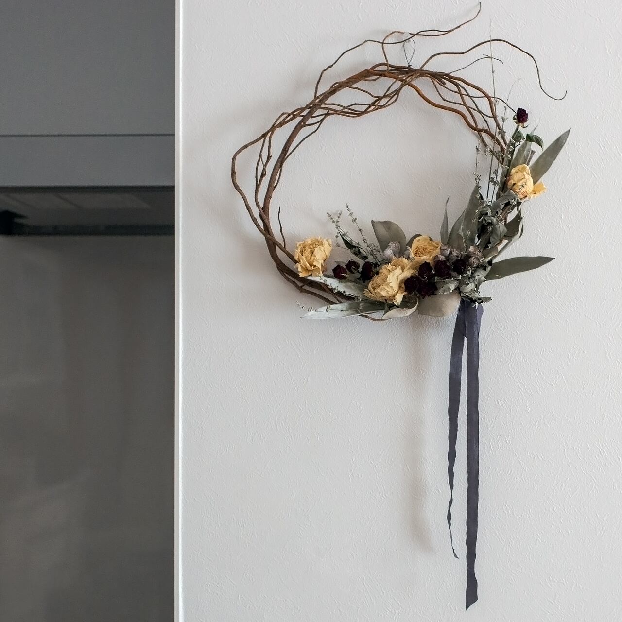 シックな色合いの蔓リースです。